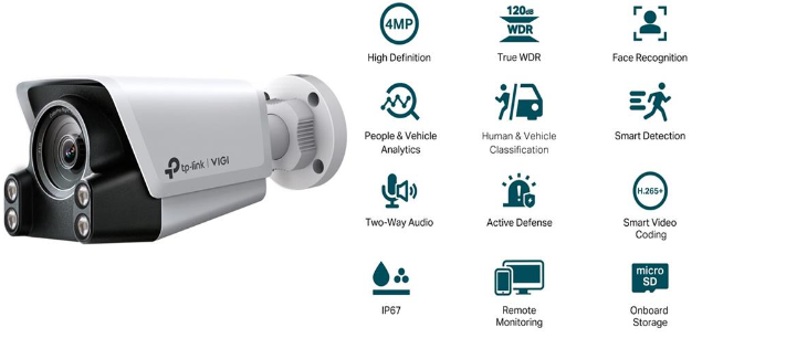 The camera comes with 4MP–more than enough pixels to pick up some of the more discrete details. 24h Full-Color: Obtain 24-hour color details, even in pitch-black conditions, with its large-aperture lens, high-sensitivity sensor, and attached supplemental lights. Human & Vehicle Classification: Distinguishes humans and vehicles from other objects, so you receive more accurate event notifications. Smart Detection: Receive notifications and check feeds when someone crosses a boundary, enters an area you’ve set, obstructs the camera, or removes/abandons objects. Active Defense: Warn potential intruders instantly with sound and light when abnormal events. Two-Way Audio: Intelligently detect activities, inform you instantly and response automatically by smart detection and two-way audio. H.265+: Without using any extra bandwidth, your cameras transmit compressed crystal-clear video to save disk space, ease network loads, and reduce monitoring costs without sacrificing image quality. Smart Video Enhancement: VIGI’s professional technologies process videos to greatly improve their quality that is vital to your monitoring, including Smart IR, WDR, 3D DNR, and Night Vision. IP67 Waterproof: Reliable IP67 for stable outdoor performance. PoE/12V DC: Two types of power supply not only give you more convenience but also make your wiring remarkably easy. Flexible Management and Storage: Take full control over your security via four management methods: the web UI, NVR UI, VIGI app, and VIGI Security Manager. Local storage is available for each method, as well as onboard storage with SD card slot (up to 256GB).